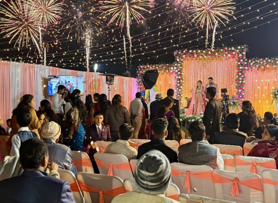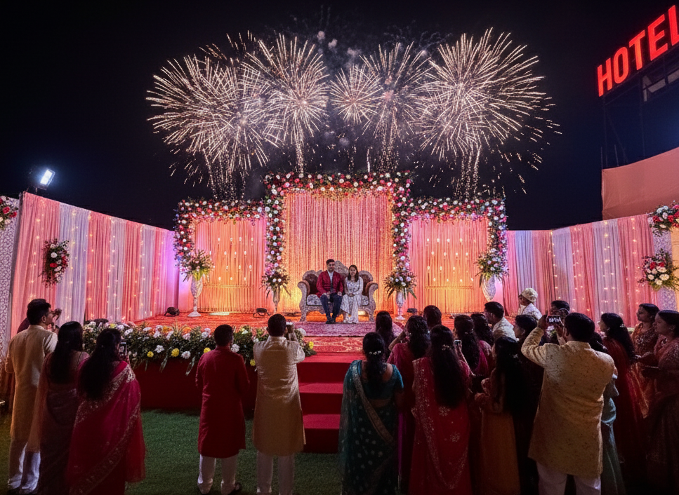 Witness your most magnificent dreams come alive under the open sky at Gold Banquet Hall III, the crown jewel of Hotel Golden Palm’s event spaces. As this breathtaking image reveals, Gold Banquet Hall III is not just a venue; it’s an expansive outdoor canvas for truly spectacular celebrations, establishing itself as Patna’s premier destination for lavish outdoor wedding venues and grand social galas.