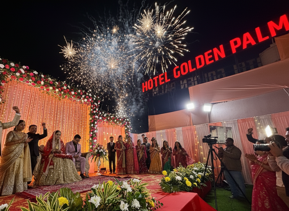 • Iconic Branding: The prominent “HOTEL GOLDEN PALM” signage illuminated against the night sky serves as a majestic backdrop, subtly branding your event with our mark of luxury and making it an instantly recognizable luxury event venue in Patna.